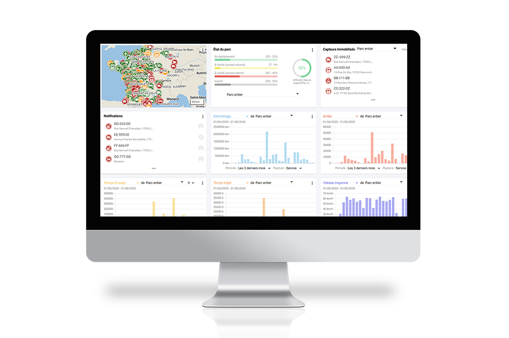 Echtzeit-Geolokalisierung Ihrer Flotte: Sie erhalten einen Überblick über die Aktivitäten Ihrer Fahrzeuge, analysieren die Fahrleistungen Ihrer Fahrer und verbessern so Ihre Dienstleistungen, um wettbewerbsfähiger zu werden.
